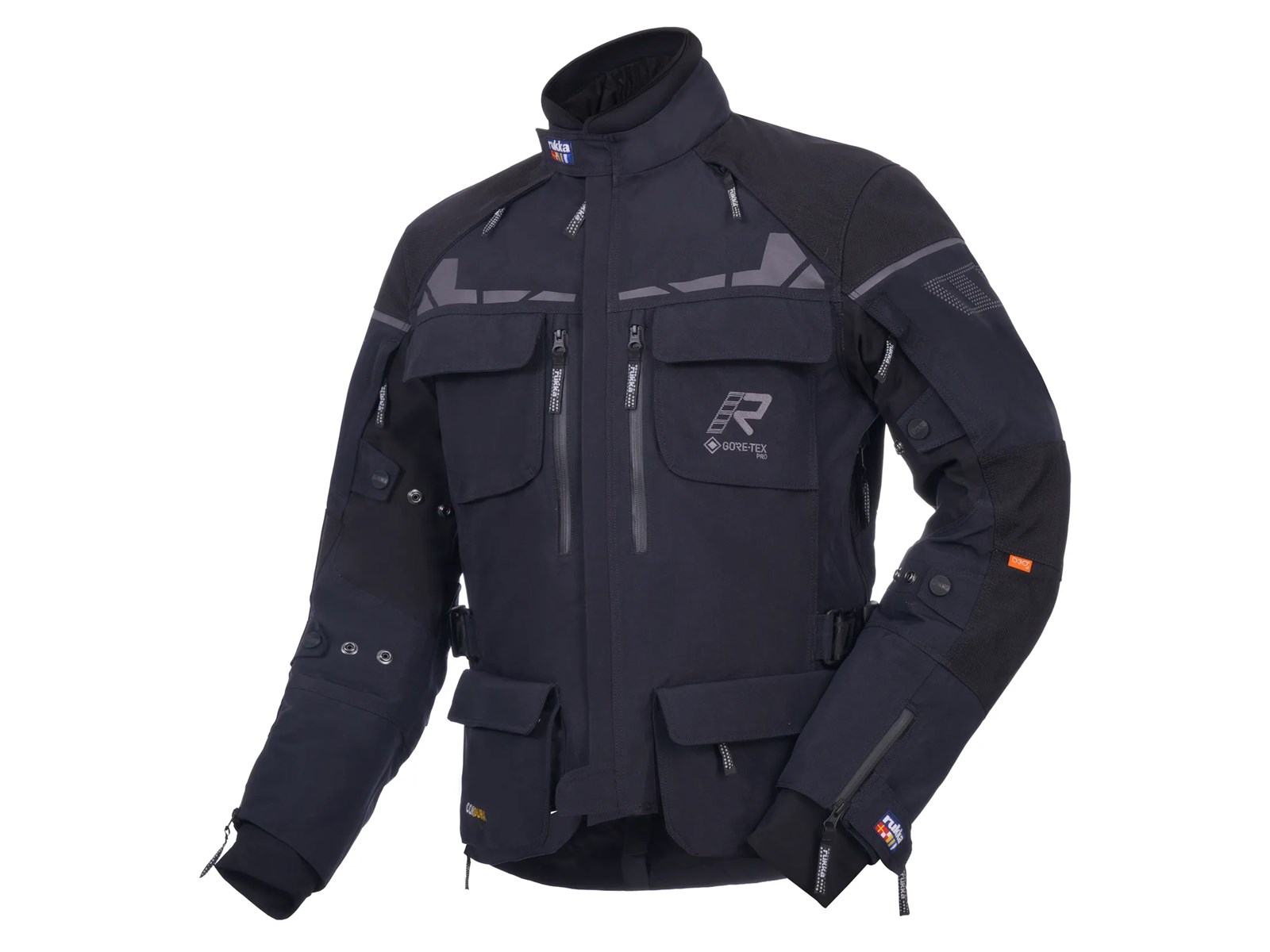 Muška motociklistička jakna Rukka Adventure. Mekani neopren u ovratniku. Integrirana fleksibilna ATS GORE-TEX ogrlica, koja se po potrebi može sakriti u džep oko vrata. Elastični materijal ispod rukava i na leđima. Manžete s patentnim zatvaračem i vodootporne manšete. Podešavanje širine rukava s kopčama na ramenu i podlaktici. Velcro kopčanje na rubu i manžetama. Međunožna traka i lanac za povezivanje oko struka s hlačama. Podesivi pojas sa strane tijela. Izdržljiv, 100% prozračan, otporan na vjetar i vodu GORE-TEX Pro CORDURA® 3-slojni laminat kao vanjski materijal. CORDURA® 1500D ojačanja na ramenima i laktovima otporna na habanje. Dva vodonepropusna džepa s gornje strane s patentnim zatvaračem i kopčanjem na gumb. Dva prsna džepa s kopčama. Veliki vodootporni džep na dnu leđa.